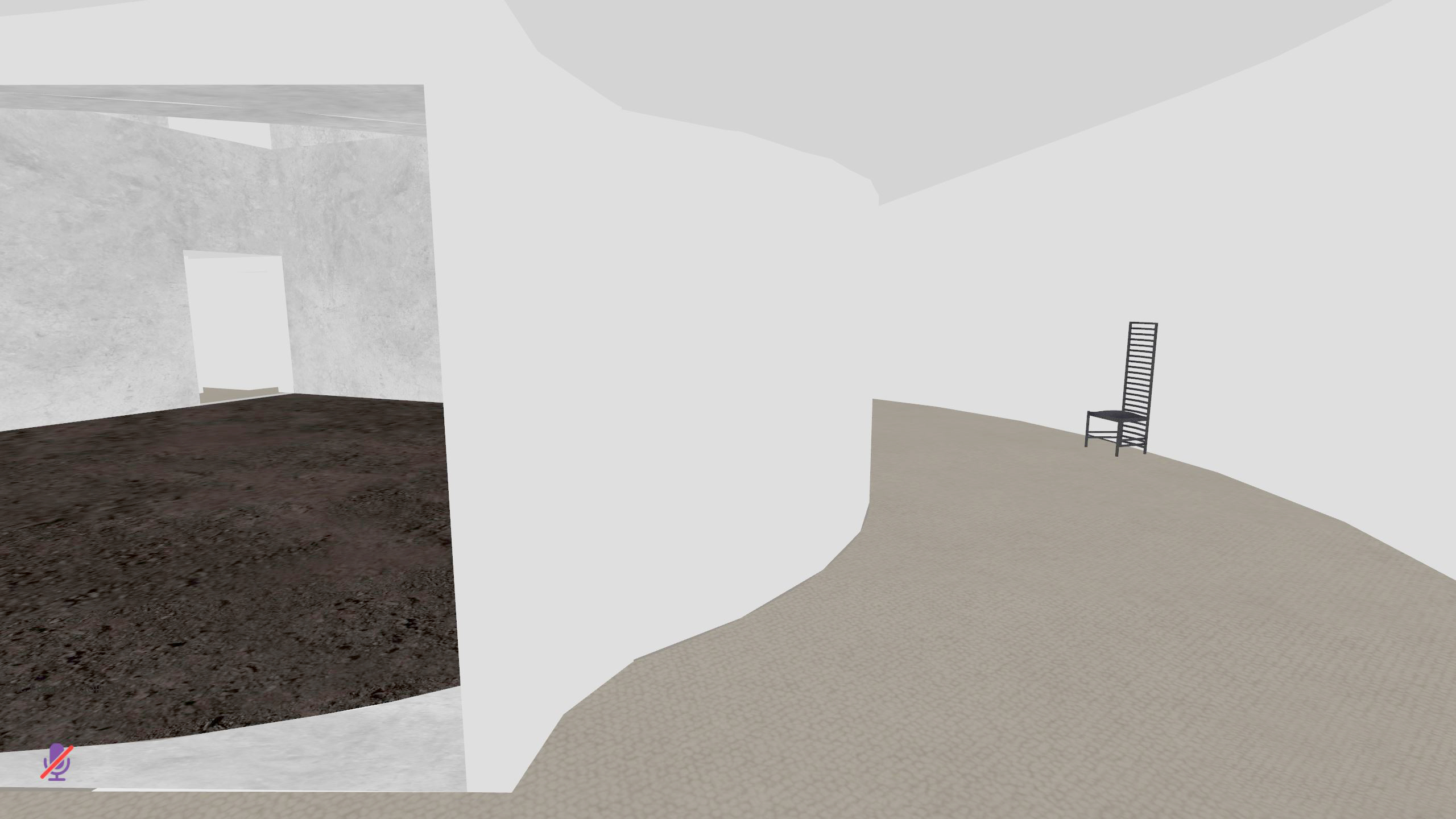Users are spawned within the middle of the sunken courtyard, now resembling a dark pit upon looking upwards to the view of the sky beyond a concrete tunnel. We use different expressions of the house’s iconic chair to represent the different stages of grief along the bent hallway room. The opposite end of the building is remodelled from a study room into vertical circulation to carrying users toward successive stages, creating a sequential loop of space with a uniqe experience on each level. We exploit the use of Unity’s single-sided surfaces by orienting the courtyard upward and away from the user’s perspective so that one can see through to the sky. The successive courtyard surfaces become become increasingly vegetated to reflect the passage of time along the grieving process. Once navigated to the top: Acceptance, users are permitted to leave through the front door, back out into the world.