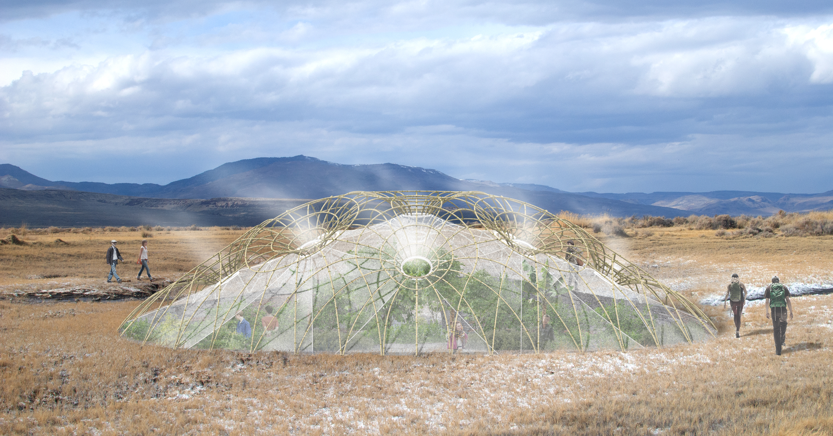 The structure is inspired by those of the native Paiute people who would bend and lash willow branches together to compose the shells of their temporary shelters. We proposed a contemporary interpretation of this tectonic system with bamboo for a more stable and permanent yet still natural and lightweight material. A layer of ETFE film is suspended from the occuli of this shell, sealing the space below to allow light through while trapping heat and humidity. Saline brackish water is channelled from an adjacent geothermal pool through a gravity gate to flood the gravel floor of the structure. Occupants agitate this water as they navigate through the room in a mandatory footbath, expanding the surface area of this naturally warm water to accelerate its rate of evaoration. This humidity condenses on the underside of the ETFE film from where it drips to the perimeter and into a collection basin from where it can be used to directly nourish the plants or distribute for human consumption. The reclaimed masonry retaining walls would behave as a thermal mass to help regulate against the dramatic diurnal temperature fluctuations of the desert climate, and the occuli portals can be opened accordingly for fresh air exchange and temperature modulation to maintain a viable climate for the plants.
