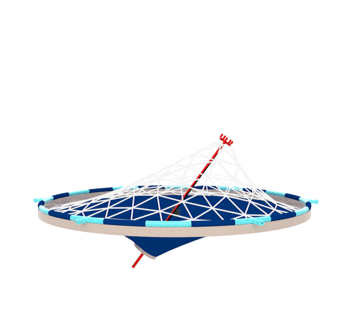 The modules would be composed from a circular hoop which secures a series of textiles. at the base are textiles for waterproofing, capillary distribution, and substrate. The upper textile is a net which provides shade for vulnerable seedlings plants, but it remains porous for plants to grow through. These upper and lower textiles are spaced apart by a central mast which can be angled to account for the vertical and lateral declinations associated with any given position across the cable net, ensuring that a cone shape is created for funneling irrigation toward the center where the plant is rooted. This mast also provides a drainage vector for runoff that would otherwise pool, preventing extra weight and root rot.