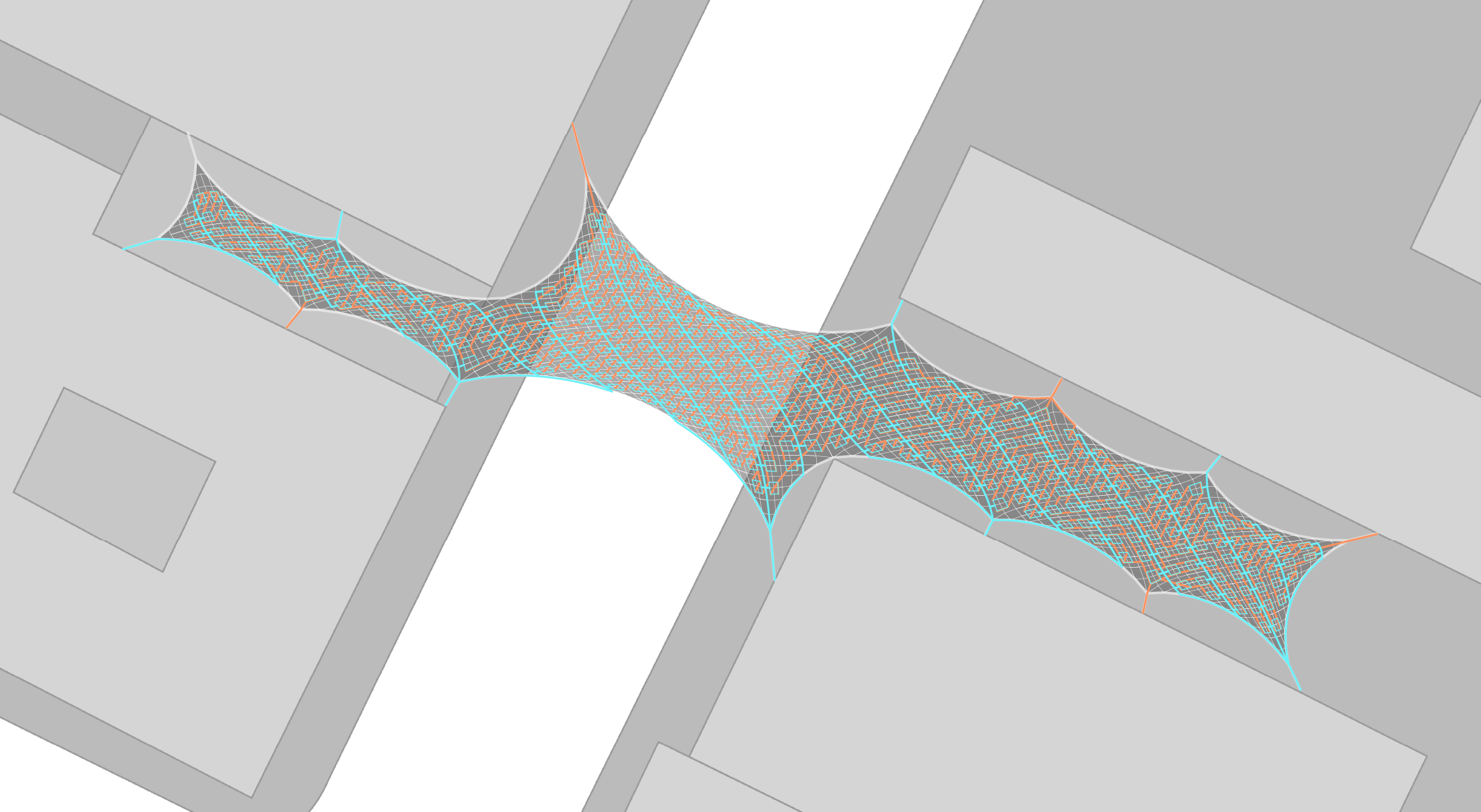 Looking closer at an example site, a series of potential interface points are identified on the facades of existing buildings. A multi-objective optimization algorithm is applied to iterate through different combinations of these points for generating a dynamically relaxed cablenet canopy.